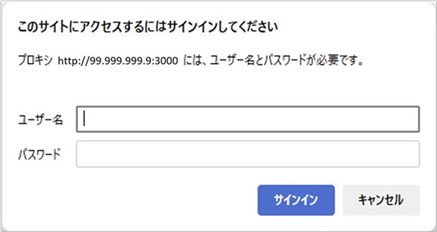 社内ネットワークに、認証を要求するプロキシサーバが配置されている場合、そのプロキシサーバでの認証を要求する画面(下図)が表示されます。ユーザ名とパスワードを入力下さい。同画面では、「ユーザ名とパスワードを保存」にチェックすることによって、入力したユーザ名とパスワードを保存することもできます。保存すると、そのユーザ名とパスワードが正しい限り、次回以降は、同画面が表示されなくなります [1]。